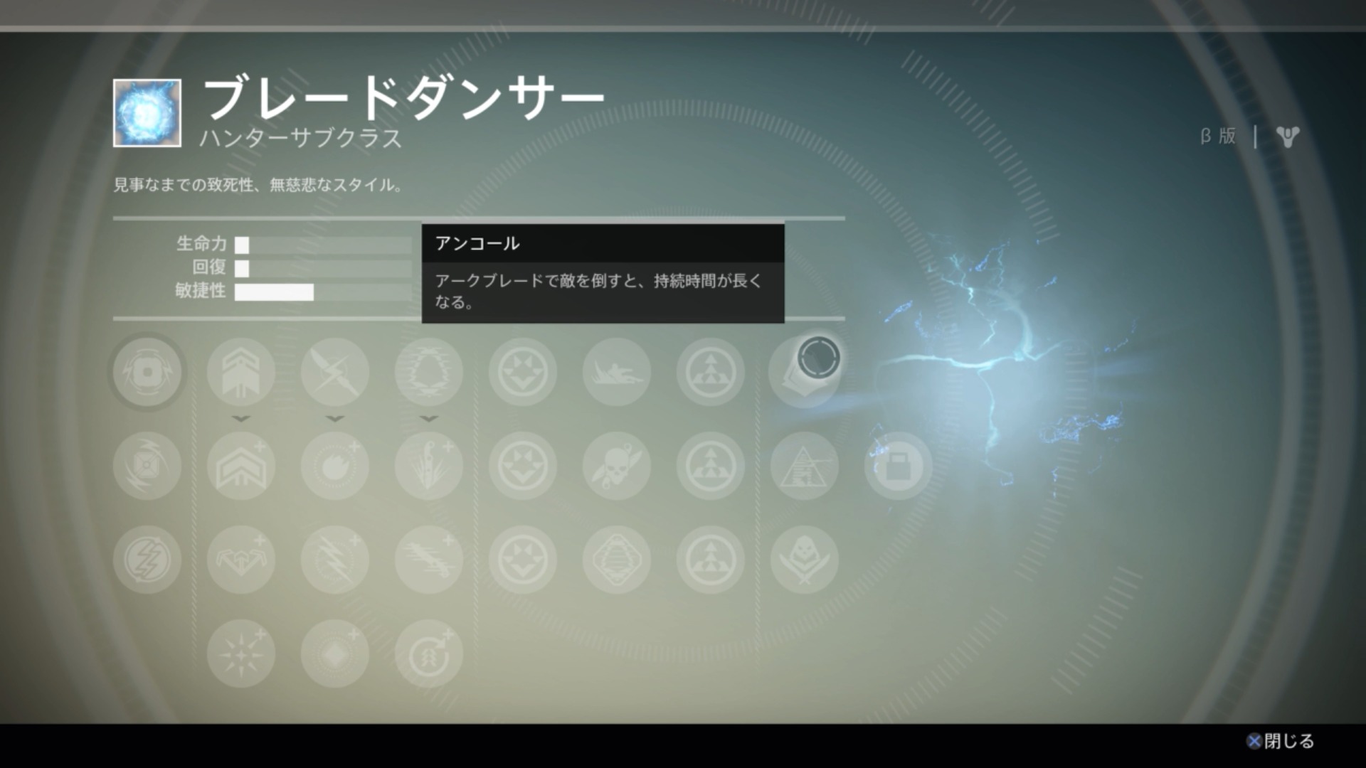 アークライトを剣に溜め、雷光で敵を滅ぼせ。 発動中はTPS画面になり、一定時間経過か死亡によって解除される。 射撃ボタン(下記のスキルを取得した場合は置き換わる)か格闘ボタンでホーミング切りが発動し、ある程度の高度差があっても追尾する。 時間消費に加えて派生スキルを使ったり切るたびにゲージを消費する、ブリンクストライクとは異なり空振りしても減る 発動中でもグレネードの投擲や仲間の蘇生は可能。 エキゾチック防具:第三の男のマスクでゲージの消費を抑えられる