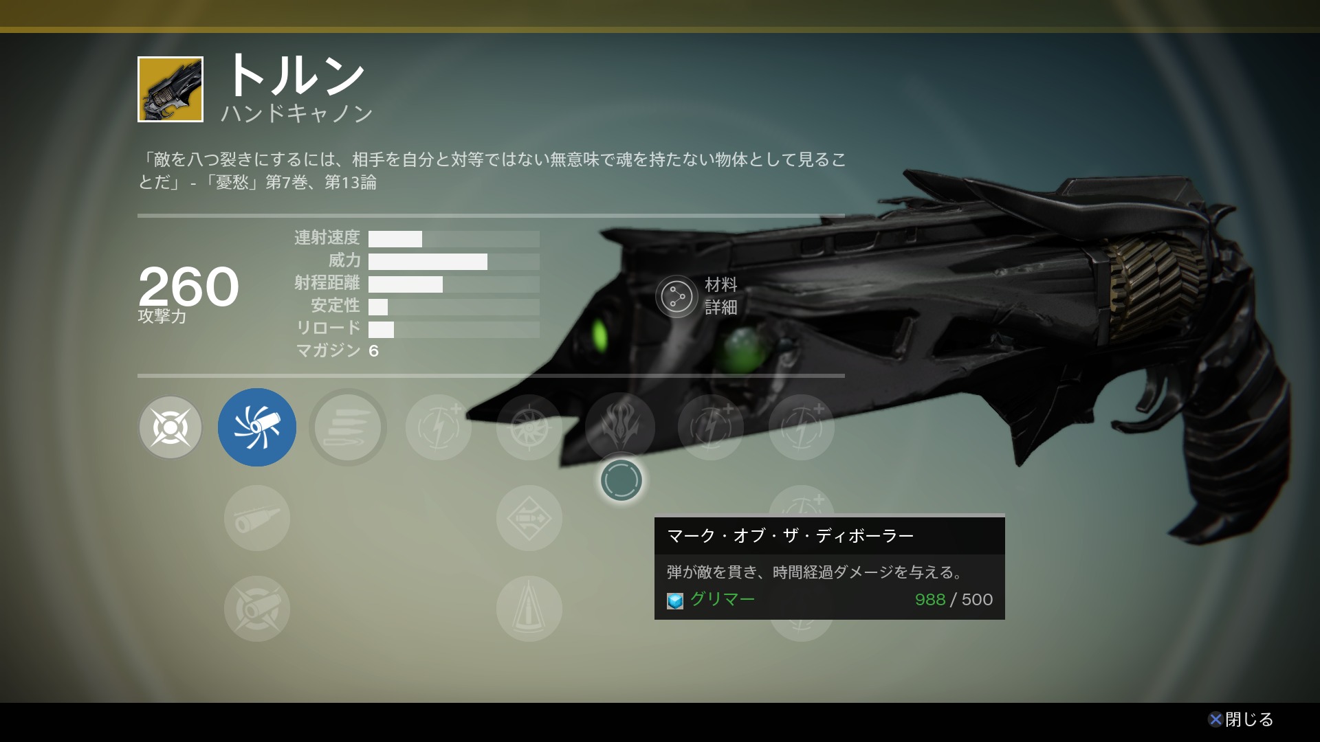 | キネティック・ダメージ | 高精度バリスティクス | 最後の弾 | ダメージ強化 | スナップショット | マーク・オブ・ザ・ディボーラー | ダメージ強化 | ダメージ強化 |