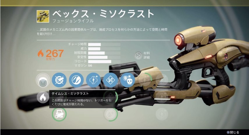| タイムレス・ミソクラスト | アグレッシブ・バリスティクス | 禅モーメント | ダメージ強化 | 拡張マガジン | クラウド・コントロール | ダメージ強化 | ダメージ強化 |