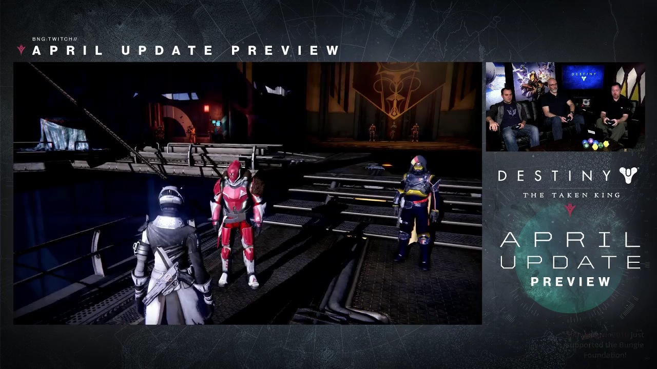 BungieのRyan Paradis氏によると、“4月の更新”は邪神オリックスが死亡したものの、まだ“宿られた兵”の脅威が残っているという時系列的にやや進んだ状況を背景に新コンテンツの導入を図るもので、リーフの拡張にフォーカスしている。クエストは“宿られた兵”の新たな脅威と戦うために取り組む忠臣バリクスを軸に展開し、“降り立ちし邪神”のその後に生じた小規模なプロットが用意されている。