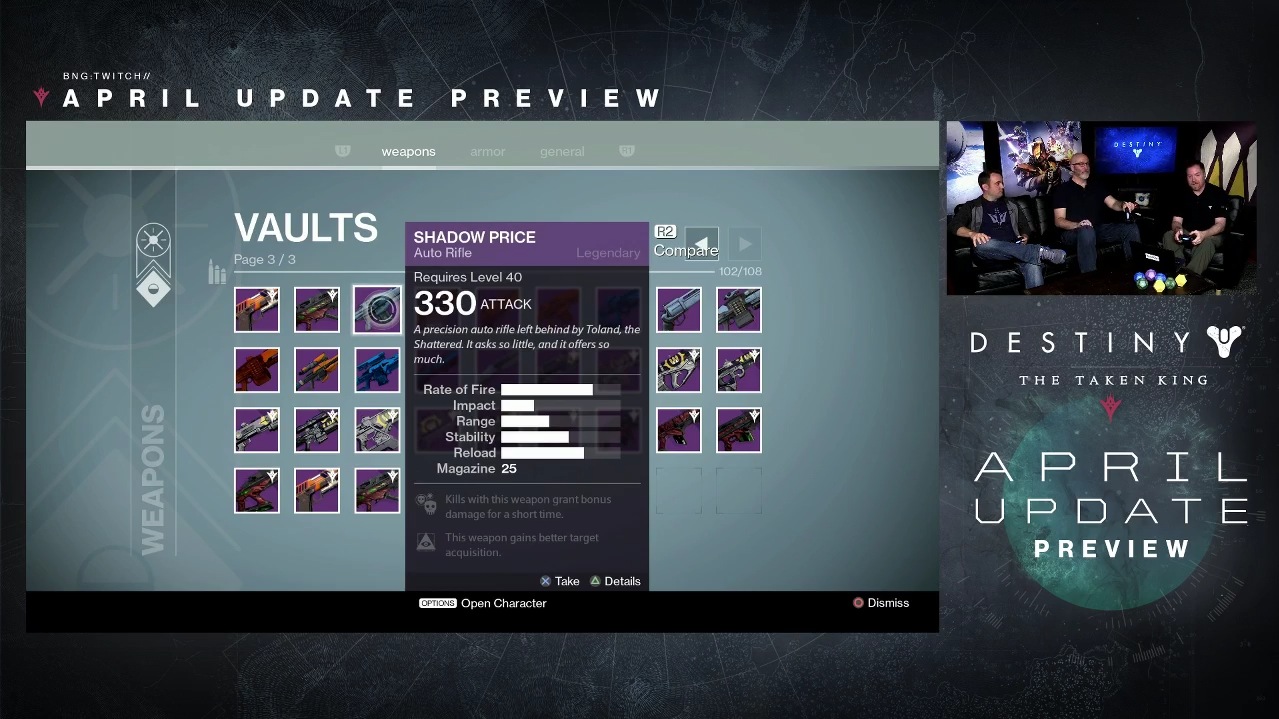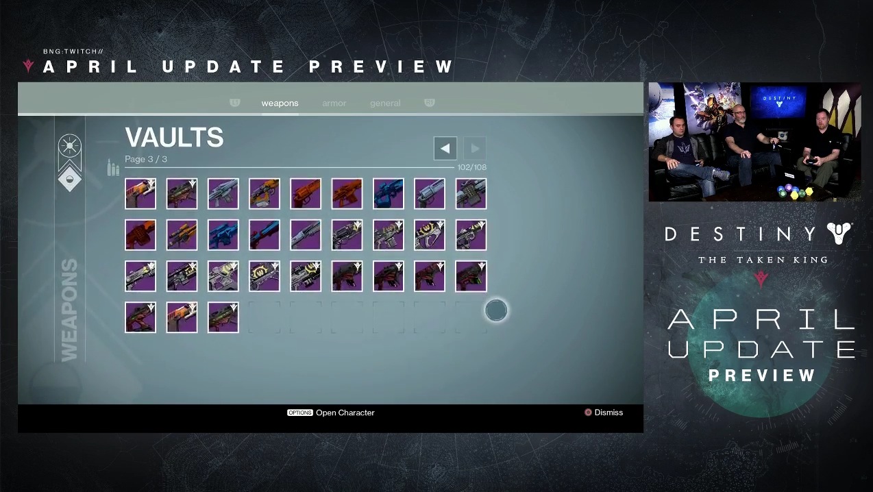 ”4月の更新”で「Vault(保管庫)」が拡張される。メニュー数が1ページ増え、武器の保管が108まで可能になる。
