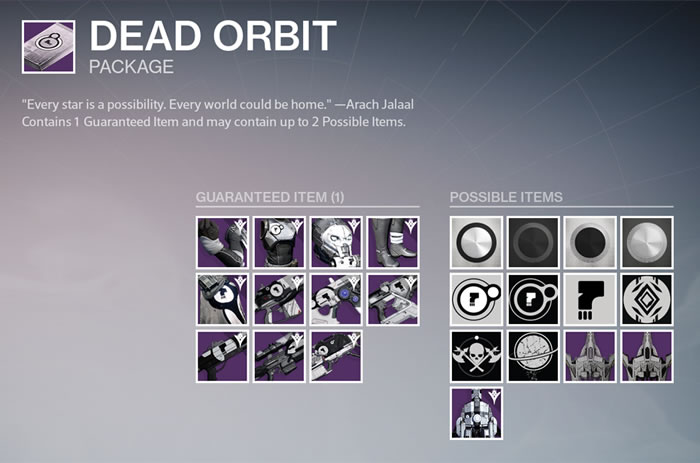 ファクションのランクアップで入手できるパッケージ内アイテムの一例。左から「バンガード」、「デッドオービット」、「ジャジメントの認知(ハウス・オブ・ジャジメント)」、「クリプト考古学(クリプトアーキ)」。