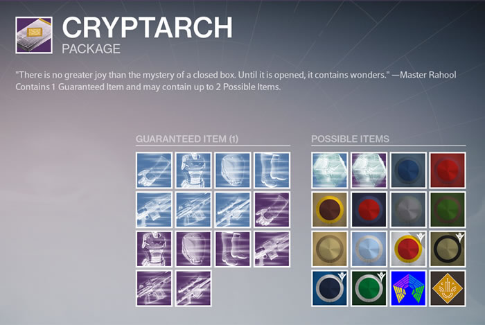 このアイテムの詳細メニューからは、「Guranteed Item(ドロップが保証される1つ以上のアイテム)」と「Possible Item(ドロップの可能性があるアイテム)」を確認でき、使用する事でランダムにアイテムを入手できる。