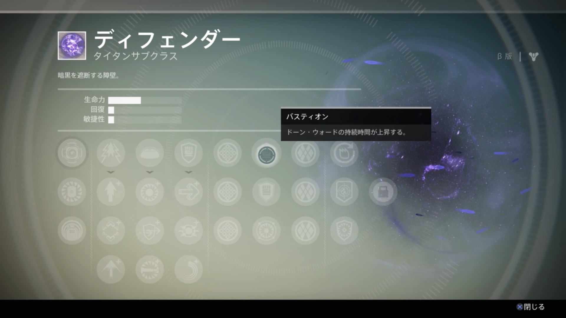 ボイドの光を破壊不能なシールドに変化させ、自分と味方を敵の攻撃から守る。(効果時間:30秒・バスティオンで+15秒)