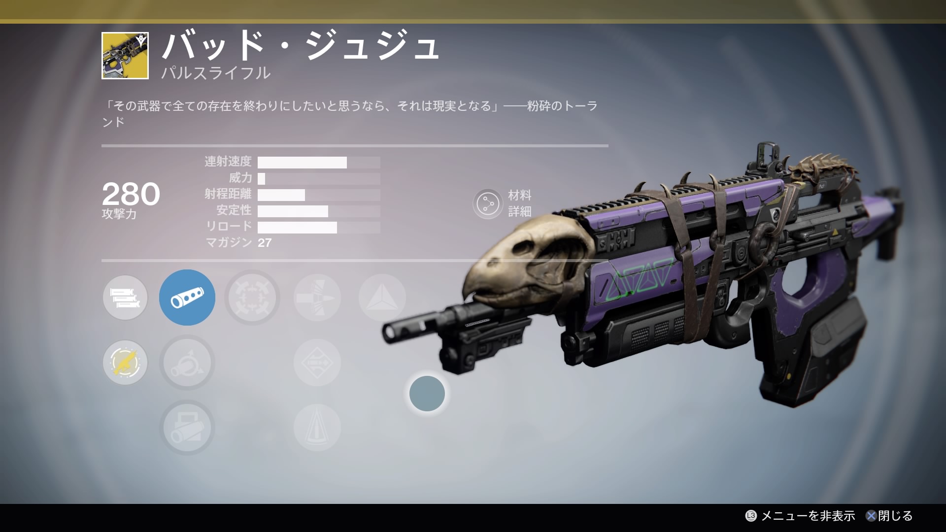 | フルオート | スムーズ・バリスティクス | ヒップファイア | アーマー貫通弾 | 呪いのストリング |