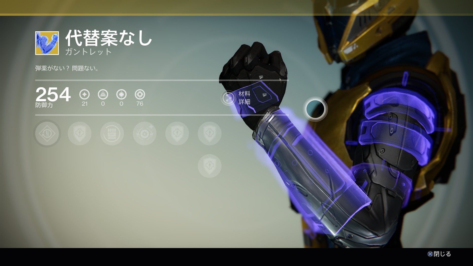 個人的に唯一まともな外見のタイタン用エキゾ防具。これだけで非常に大きな価値がある。が、パルス使いとしてはリロ速度上昇オプションを選べないのは性能面で非常に困る・・・ --