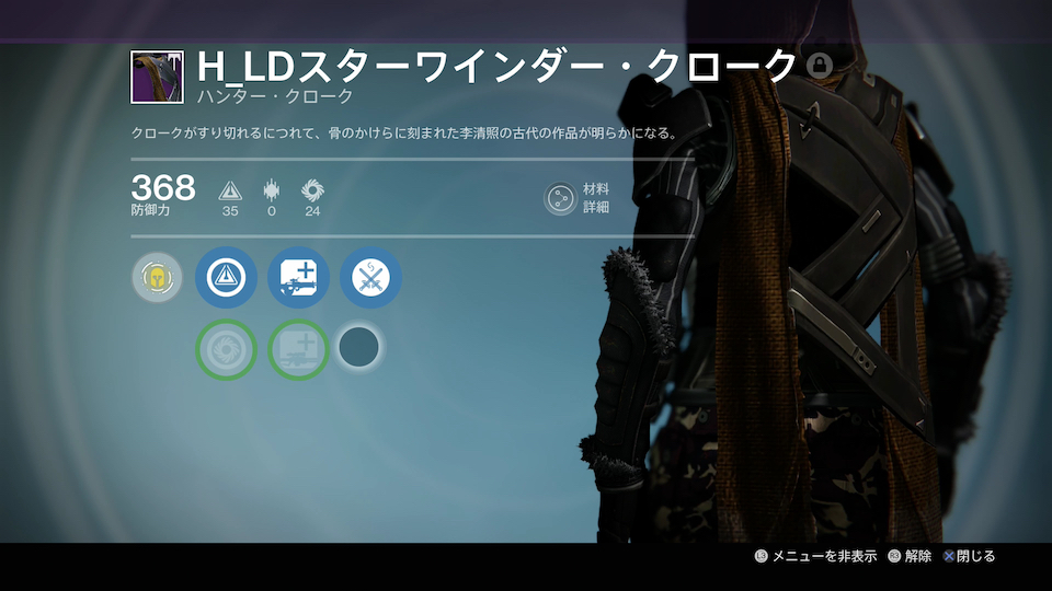 ※注意 : 画像に表示されている防御力と他の方が手に入れた時の防御力は違う可能性がある点に注意して下さい ※同じ見た目のゴーストエンジェル・クロークとはシェーダーを使った時の色の付き方の違いがあり。 ゴーストエンジェル・クロークはフードからクロークにかけて同じ色になりますがH_LDスターワインダー・クロークはフード部分が異なる色になる場合があります