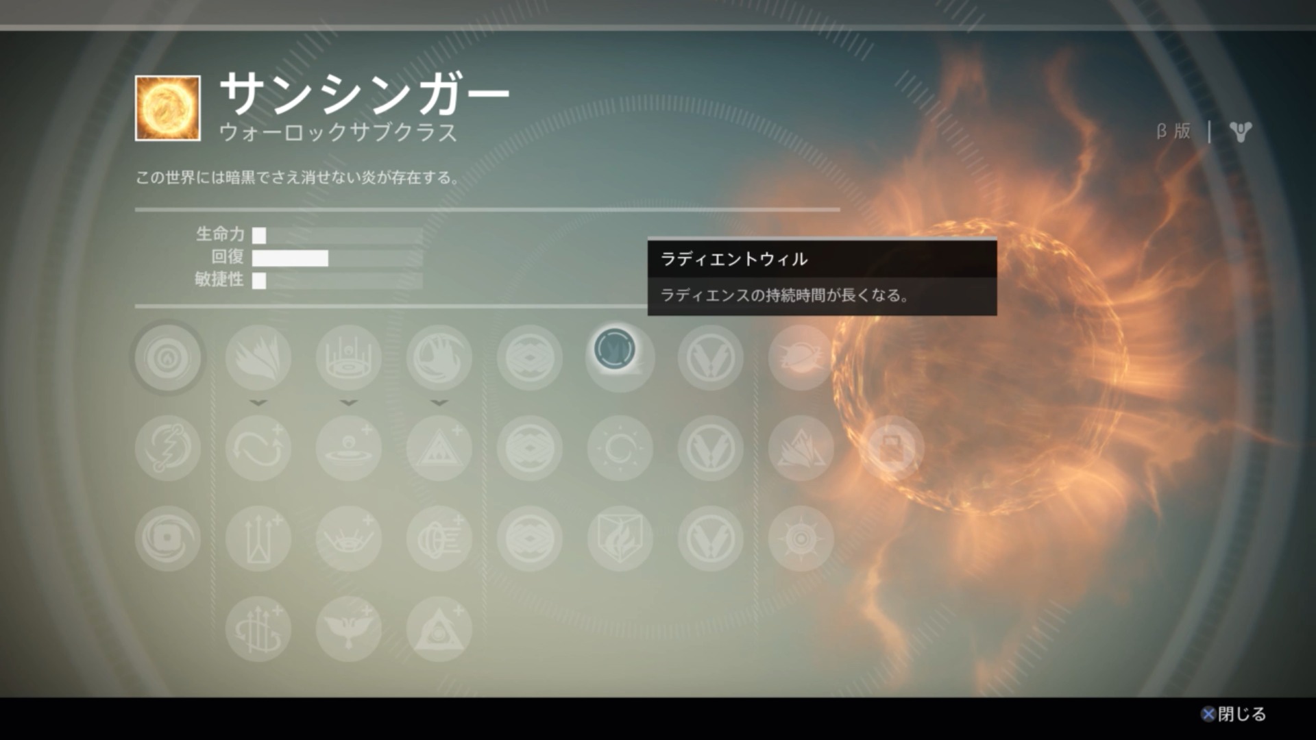・ラディエンスの恩恵を受けるスキルの一つであり、発動中はグレネードだけでなく武器のソーラーダメージでも相手を燃焼させることができるようになる。