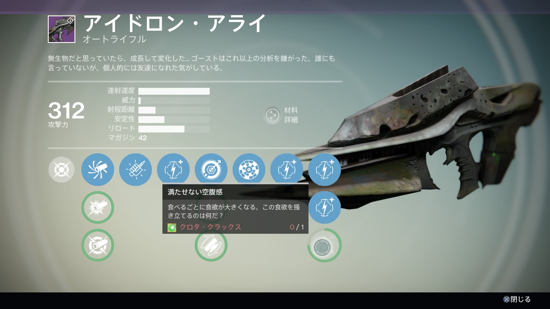 満たせない空腹感:食べるごとに食欲が大きくなる。この食欲を掻き立てるのは何だ? ピット・ハスクから進化したオートライフル。 クロタ・クラックスを使用することで、エキゾチック武器のネクロキャズム?に進化する。