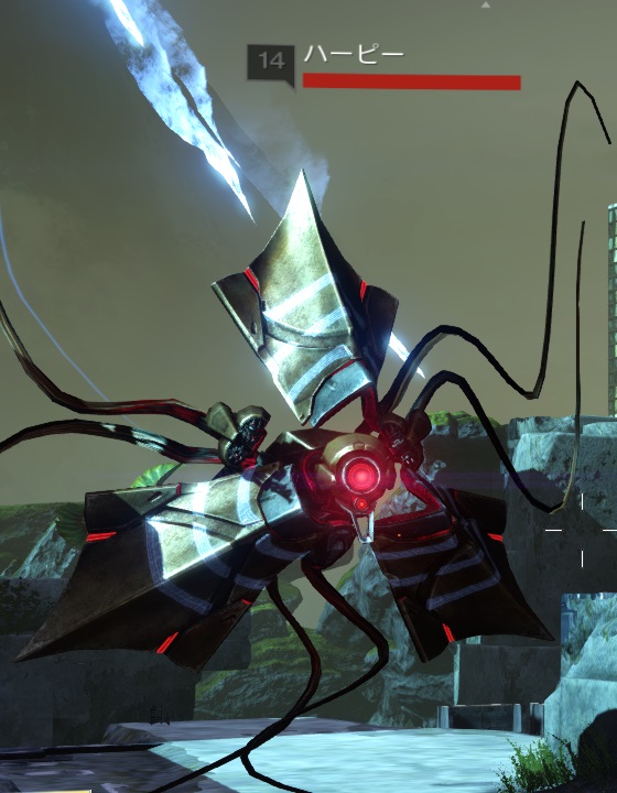 ・ハーピー 3枚のバインダーをたたんだ状態では動きが素早いが、常にプレイヤーを正面にとらえるように移動するため弱点を攻撃することは容易。 バインダーを展開すると、ゴブリンのスラップライフルと似た銃撃を連射してくる。 距離にもよるが、ハーピーの銃撃は下方向への射角が効かないため、ガーディアンが座ると頭上を弾丸が飛びダメージを受けない。 弱点は機体中央の赤く光る部分で、クリティカルヒットはするが、何故かクリティカルによるボーナス効果は発生しない。(修正により改善)