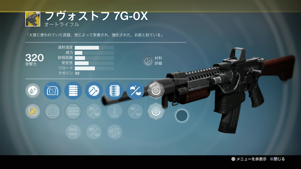 | 融合する | 伝統的な照準器 | セミオート | 螺旋溝バレル | カウンターバランス | 毎分900発 | 最後のウォーマインド(装飾) |