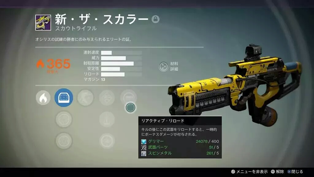 オシリスの試練でのライトハウス報酬(9連勝)の宝箱で属性付き新・ザ・スカラーが手に入る可能性がある。スキルは全く一緒