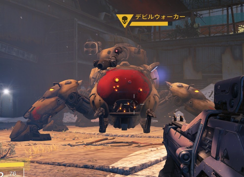 デビルウォーカーの使う主砲に当たればほぼ一撃死なので、できるだけ動作を覚えて避ける事。 主砲を使うときは構える体制になり、レーザーポインターのような物を使用するので分かりやすい。 近づくとバウンドする爆弾のようなもの(ショックグレネード)を放出し、これに当たれば一撃死なのでできるだけ近づかないこと。 また、さらに本体に近づくと溜めるような動作をし、一定時間後に高ダメージの電撃のようなものを放出する。 足が弱点であり、一定のダメージが蓄積すると足の装甲が剥がれダウンし、頭のような部分の装甲が開くのでその隙間を攻撃すると大ダメージを与えられる。 ちなみに主砲の横にあるミサイルポッドのような物は破壊できるので、余裕があれば壊しておくと攻略が楽になる。 既に装甲が剥がれた足を撃った場合、精密ヒットの印である黄色でダメージ表示がされるが、ダメージは大幅に落ちてしまう。 効率が悪いため、装甲が剥がれてない足を優先して狙うと良い。 全体的に火力が高く、範囲攻撃も行ってくる敵なので、味方がダウンした場合は焦って蘇生しにいかないこと。蘇生中に自分もまとめてやられてしまう危険が大きい。