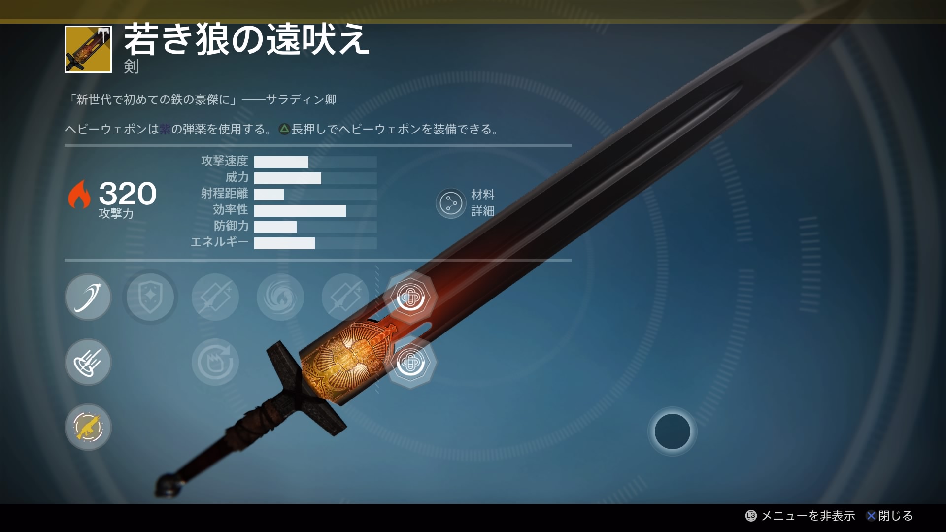 | 剣の攻撃 | 鍛えられた光 | 鞘 | うなる炎 | 鞘 | 狼の記憶(装飾) |