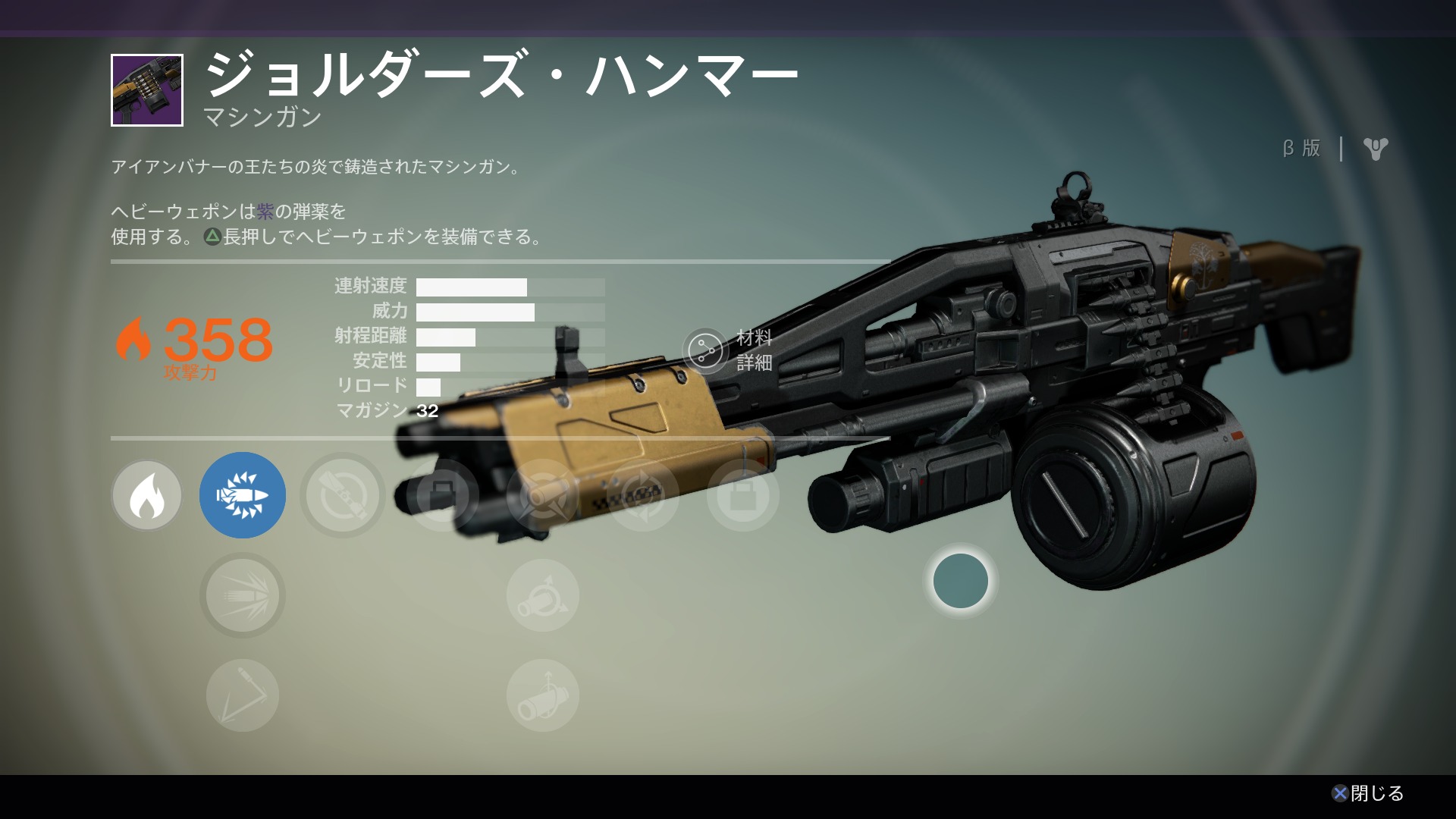 ※ジョルダーズハンマーより連射力が早くアグレッシブ・バリスティックス付きのダメージ67(素61)のMGのみ。ハンターの場合、ヘッドショット3発になるので限定的ではあるがそちらのほうが殲滅速度が約0.07秒はやい(BTRDやディビアントなど)。