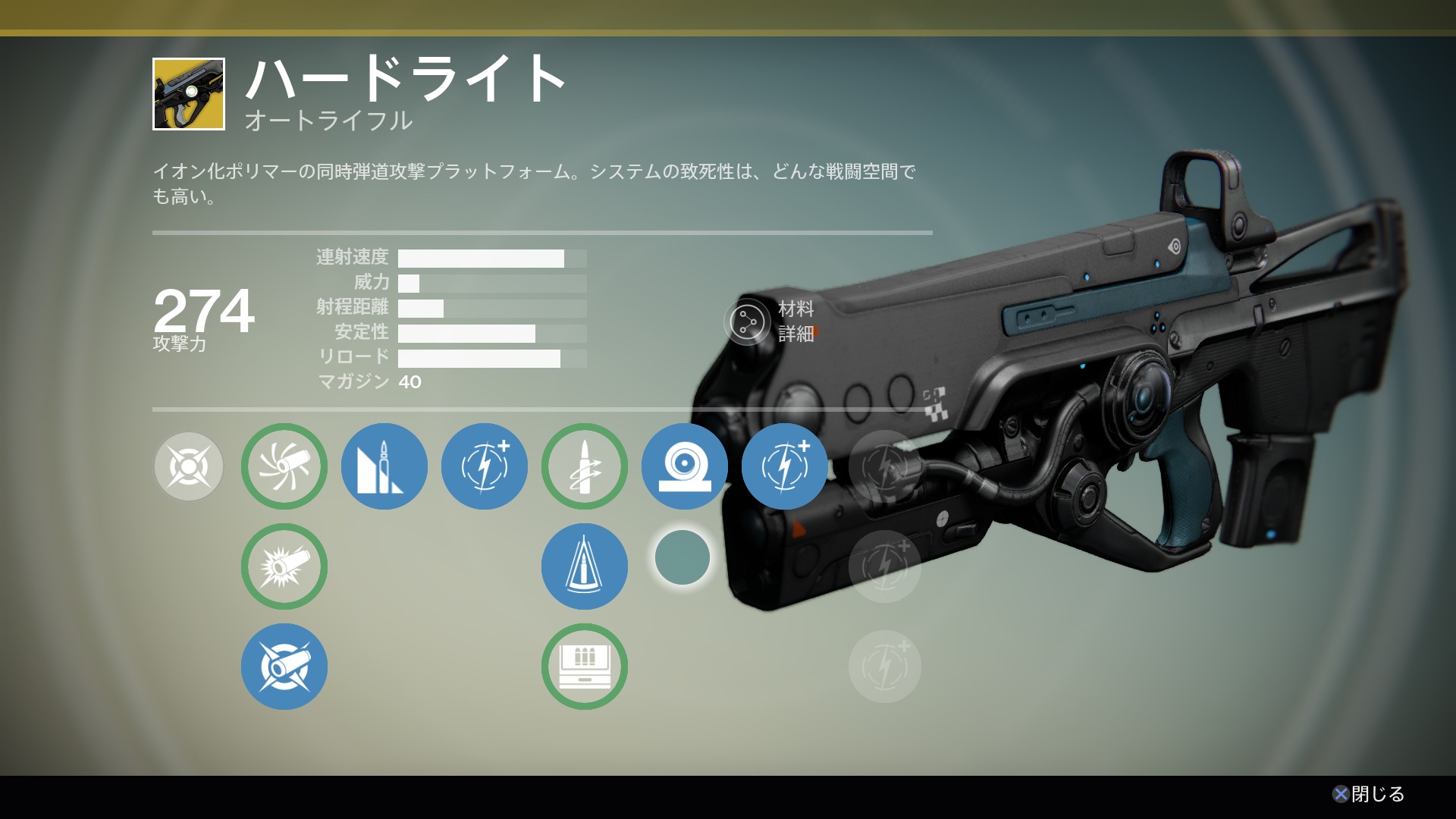 | キネティック・ダメージ | 高精度バリスティクス | グラス・ハーフ・フル | ダメージ強化 | クイックドロー | ボラタイル・ライト | ダメージ強化 | ダメージ強化 |